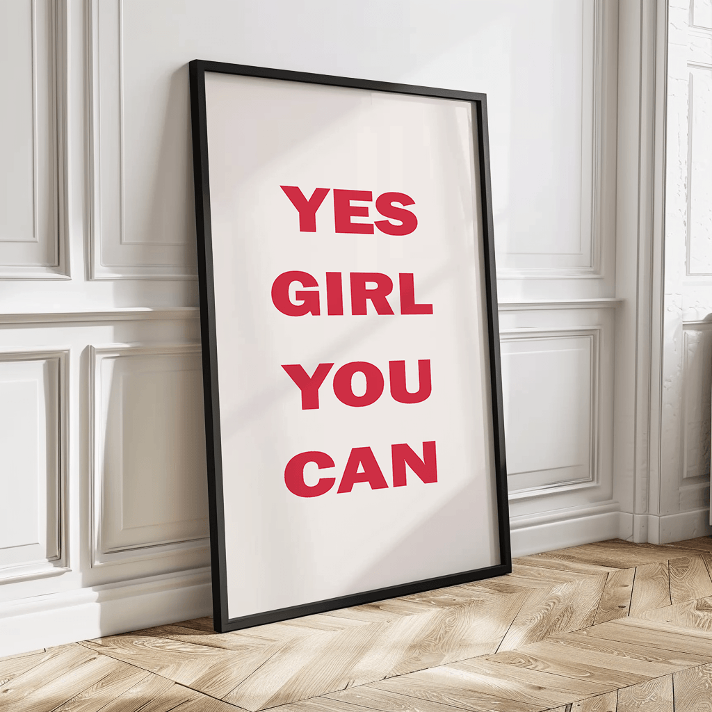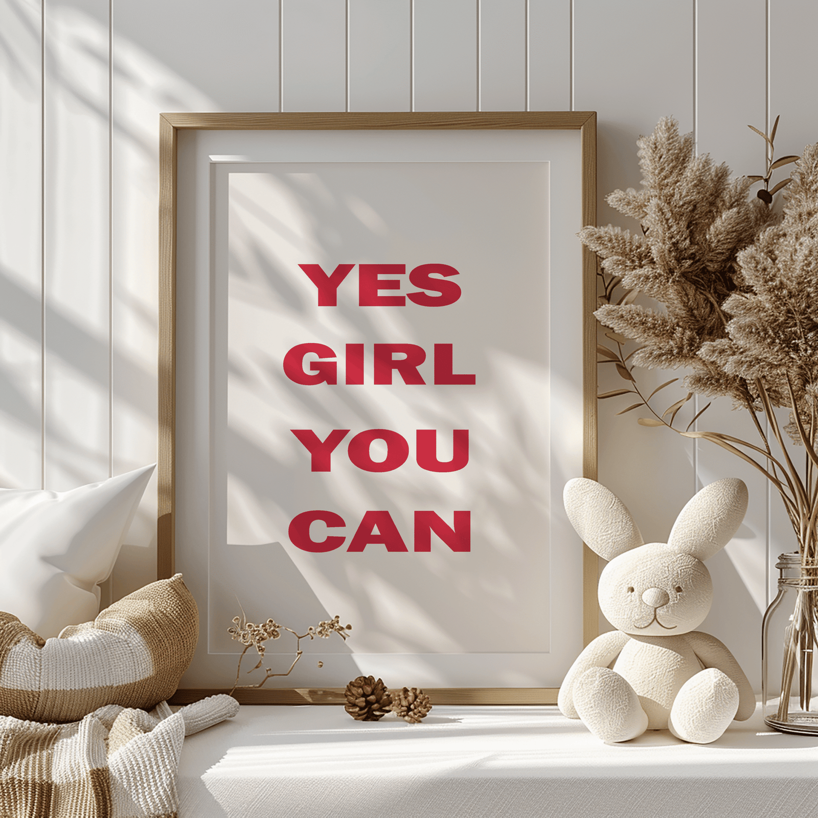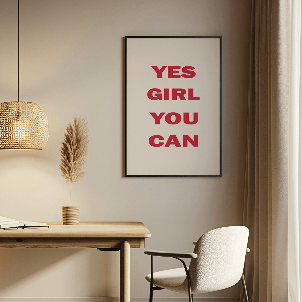 Bring motivation to any space with this beautifully framed “Yes Girl, You Can” quote print. Designed with modern aesthetics and printed on 300 GSM premium art card, it delivers sharp, vibrant quality. A glossy laminated finish protects the artwork, while the 0.5-inch black frame adds a sleek, elegant touch. Ready to hang and perfect for bedrooms, offices, or dorms, this inspiring wall décor makes a thoughtful gift that encourages confidence and positivity every day.